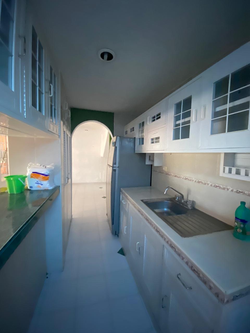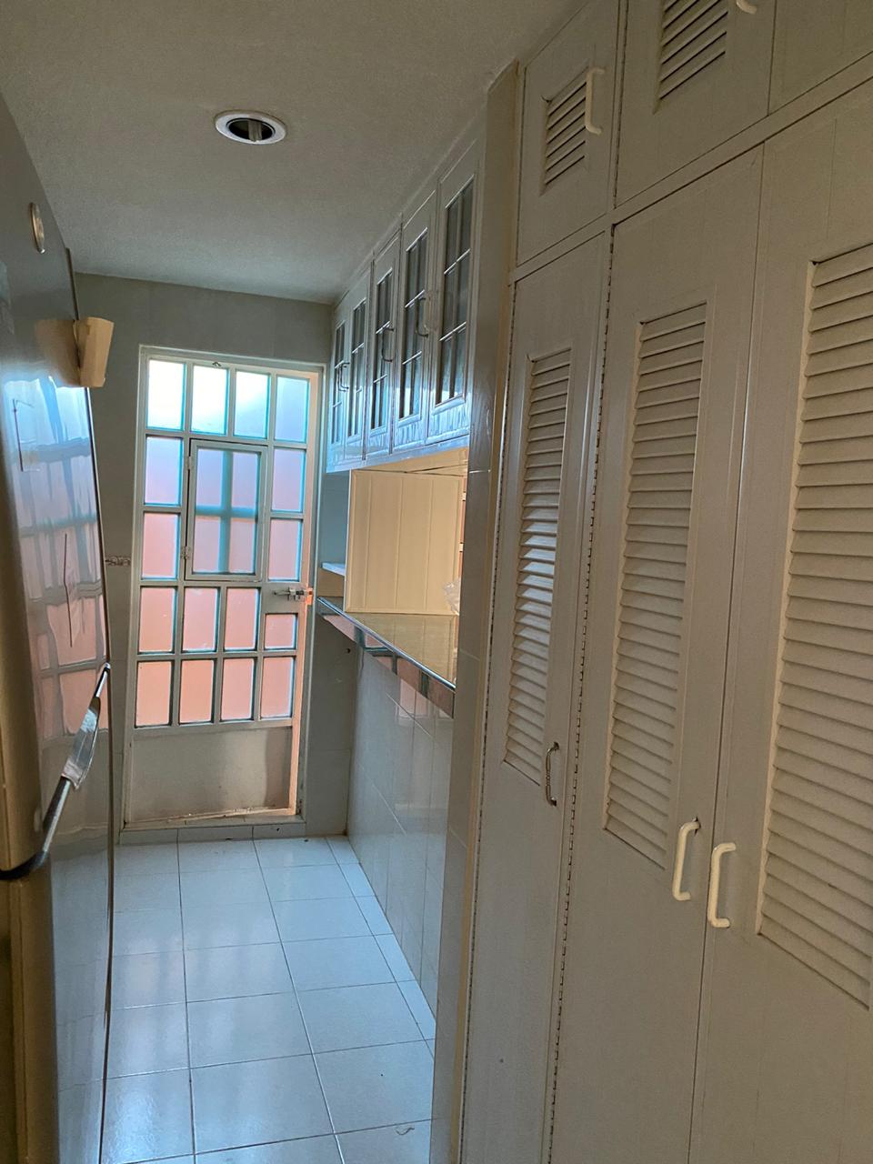 Cocina con refrigerador y alacena completa.