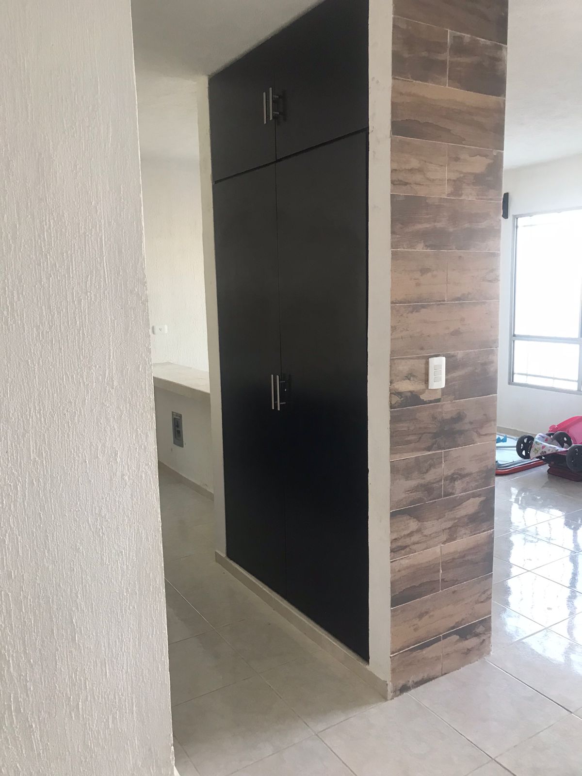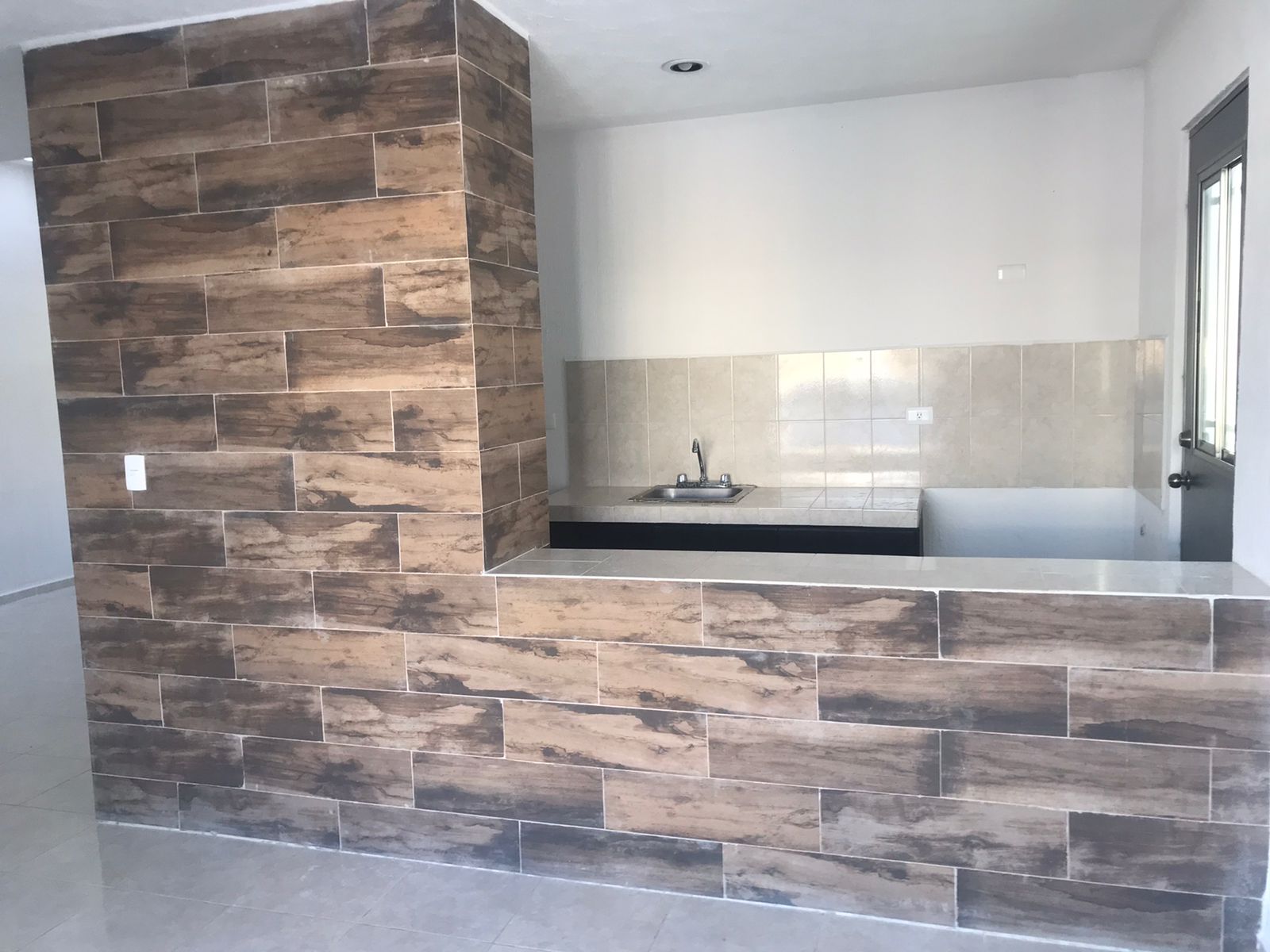 Cocina vestida con alacena de madera.