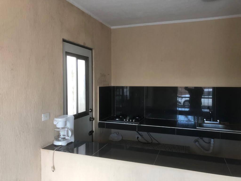 Cocina con barra desayunador, refrigerador, parrilla, cafetera.