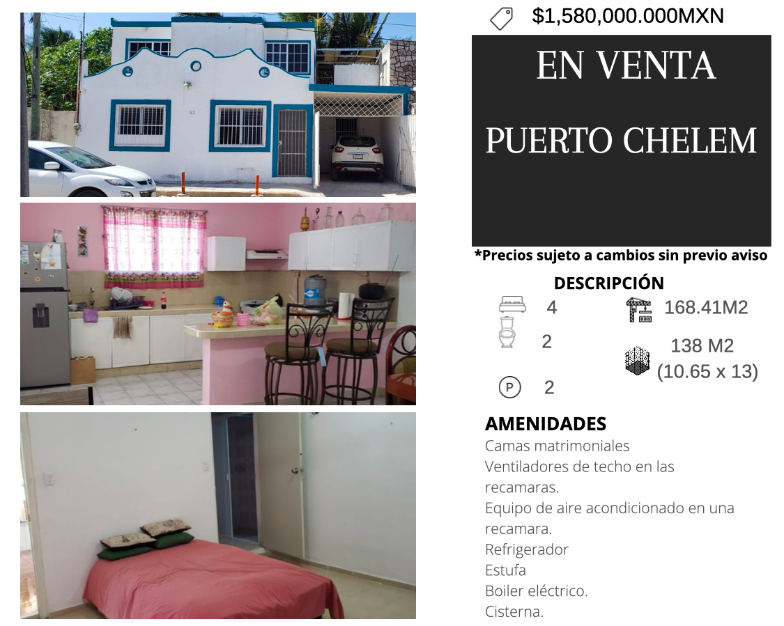 Casa en Venta completamente Amueblada en excelente ubicación en el Puerto de Chelem, Progreso a solo 30 km. de la ciudad de Mérida.