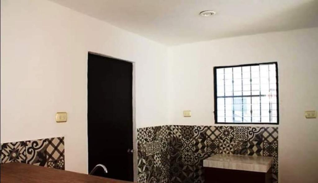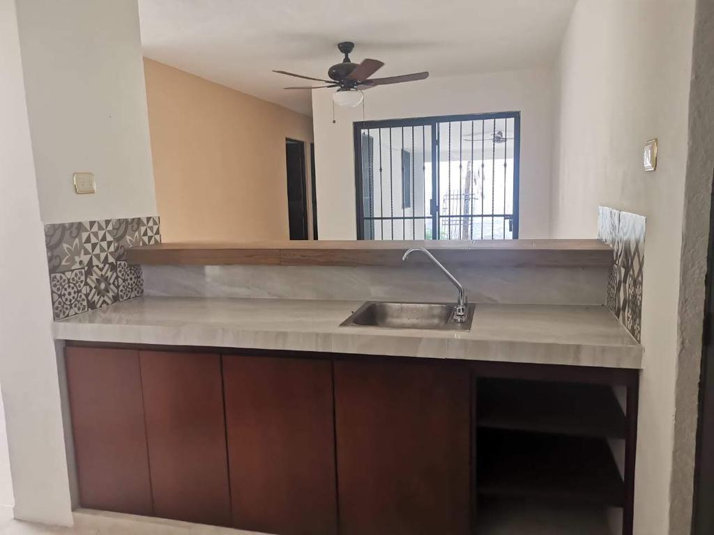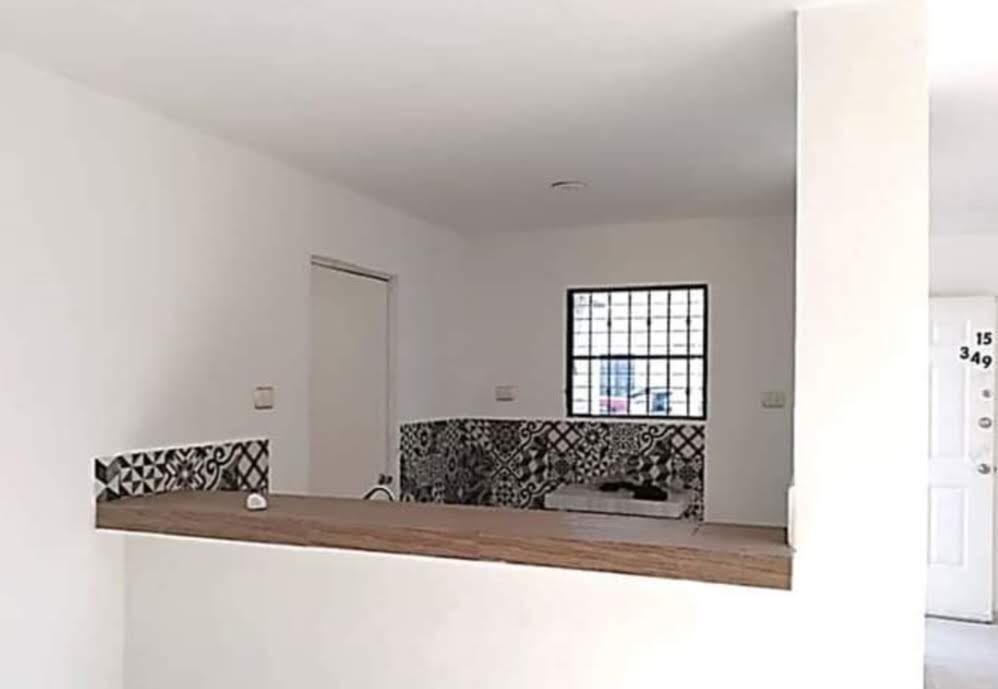 Cocina con acabados en porcelanato y loza de pasta, vestida con alacena de madera.