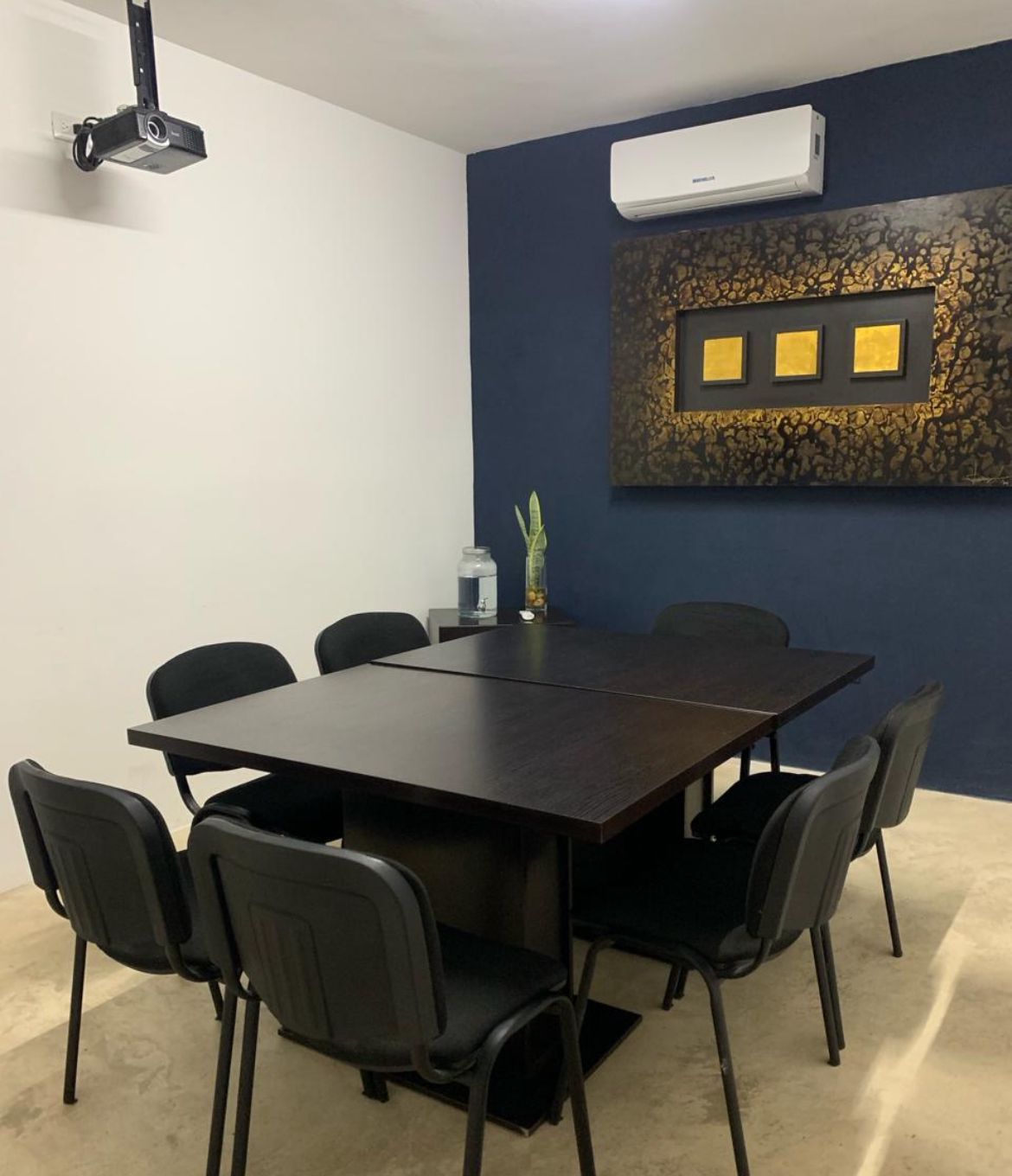 Servicio incluidos: Agua potable, internet, recolección de basura,luz eléctrica, servicio de café básico, sala de juntas equipada: con Aires acondicionado,proyector, TV, capacidad de 1 hasta 8 personas.